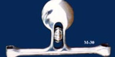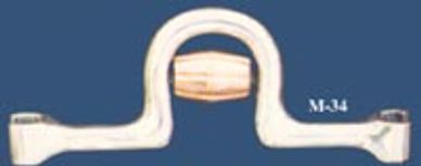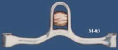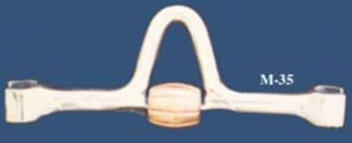 Two metal pieces attached at the center to form a jointed bar with 3 copper rollers. This mouthpiece is pretty popular -- it has a lot of movement to the sides, up and down.