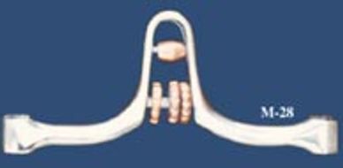 Two metal pieces attached at the center to form a jointed bar with 1 copper roller. This mouthpiece is pretty popular -- it has movement to the sides, up and down.